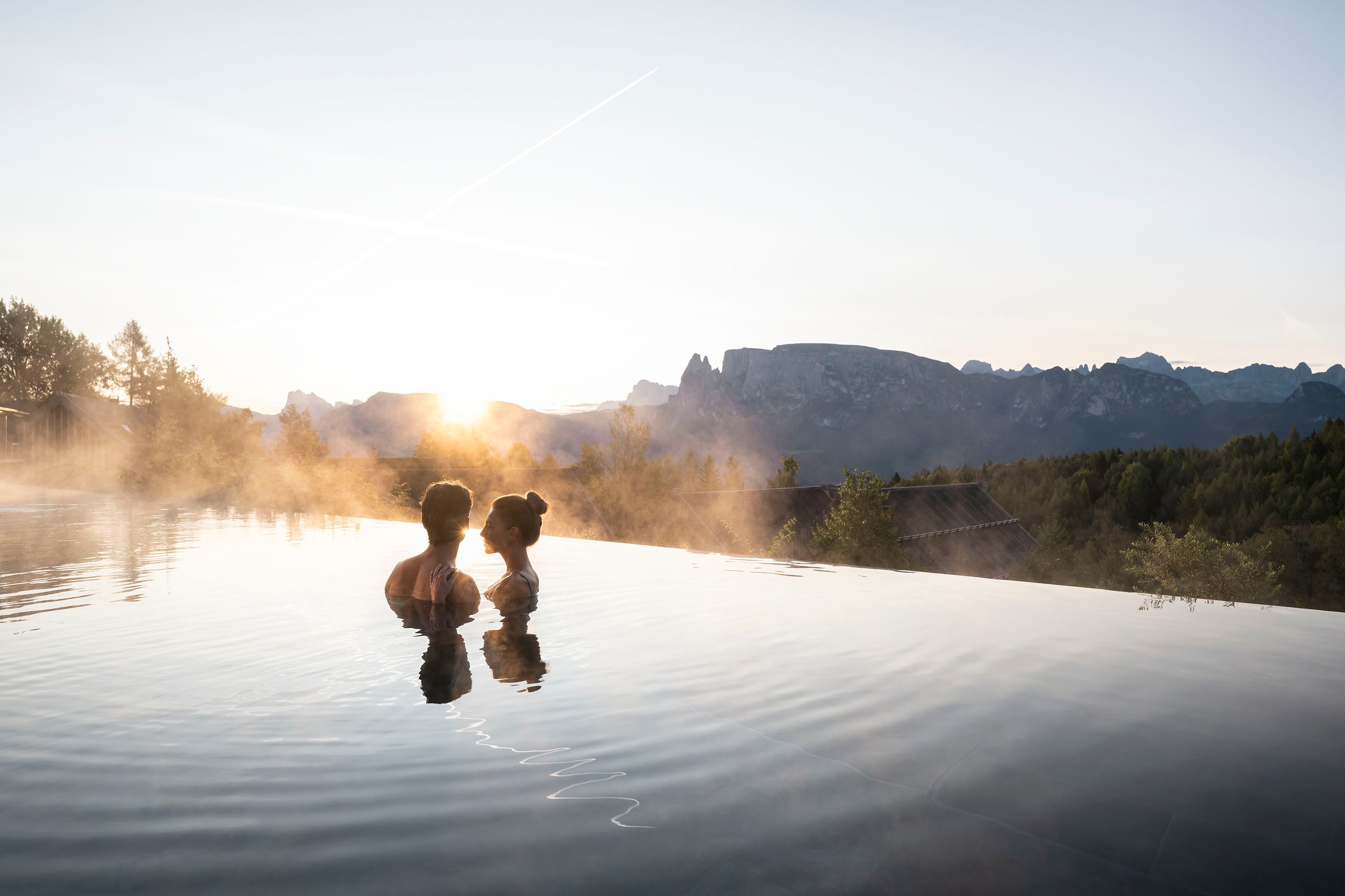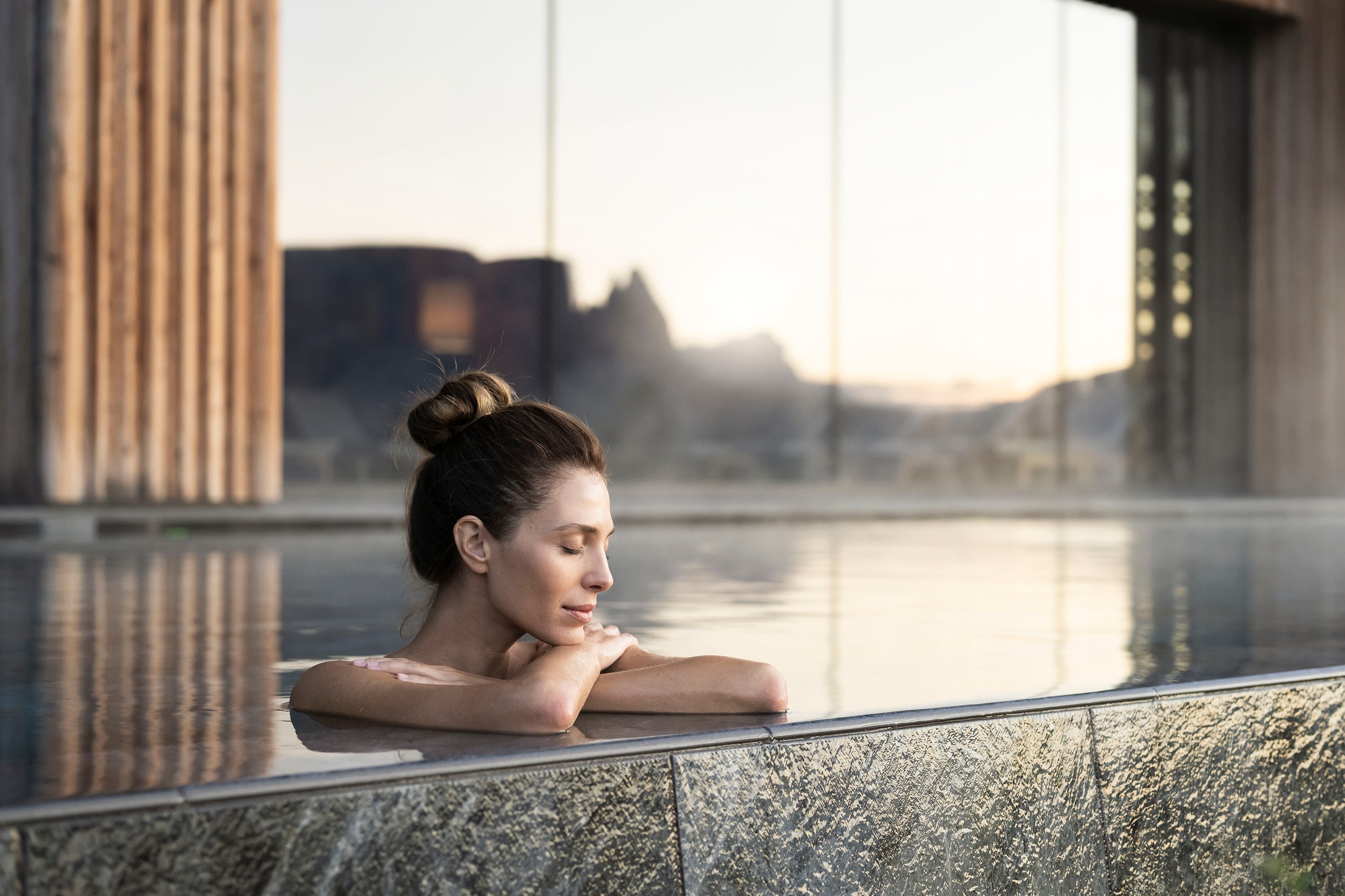 Im 23 m langen Salzwasser-Pool schweben Sie dem Bergpanorama entgegen, während die Sonne die Gipfel in goldenes Licht taucht.