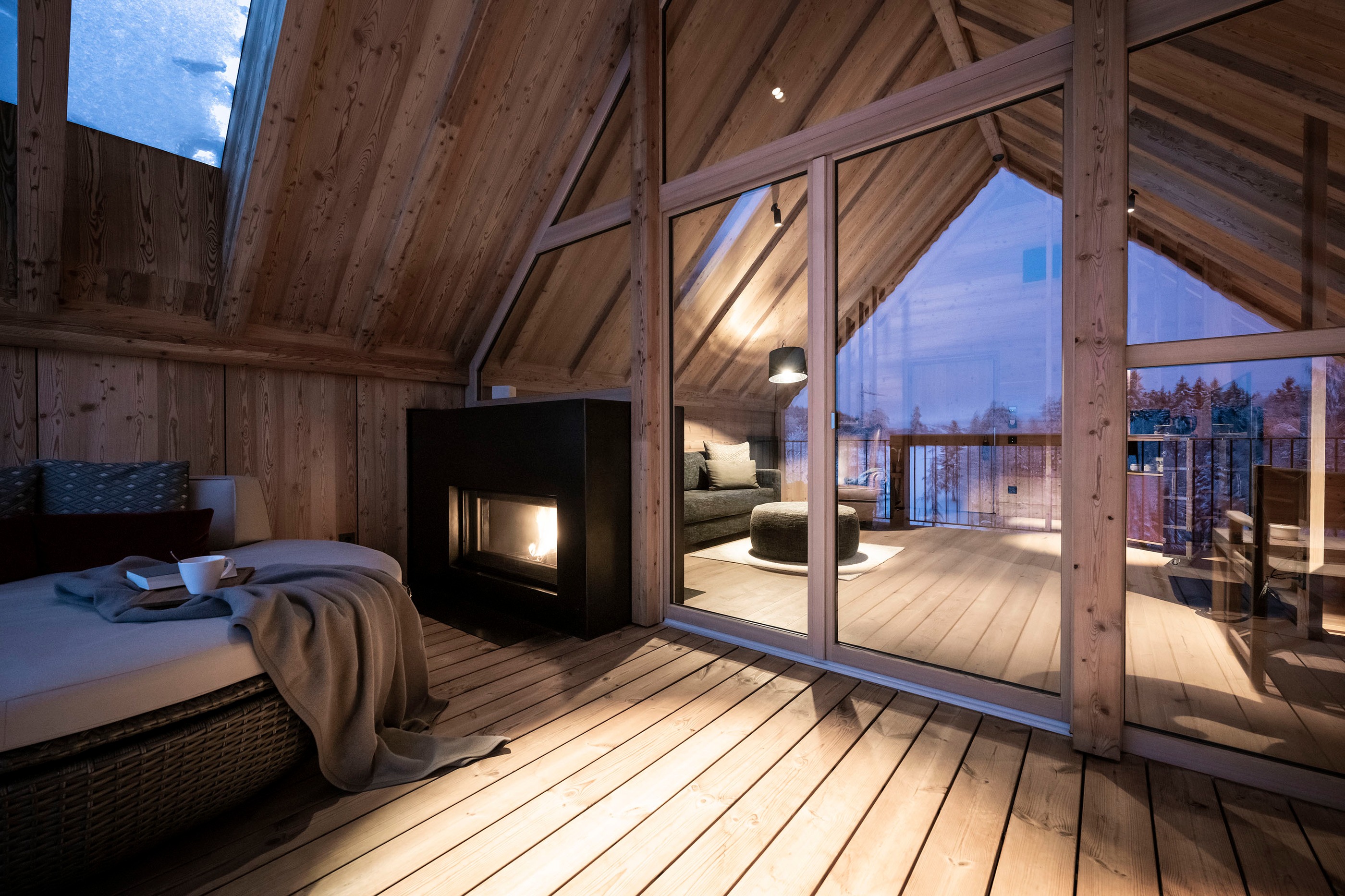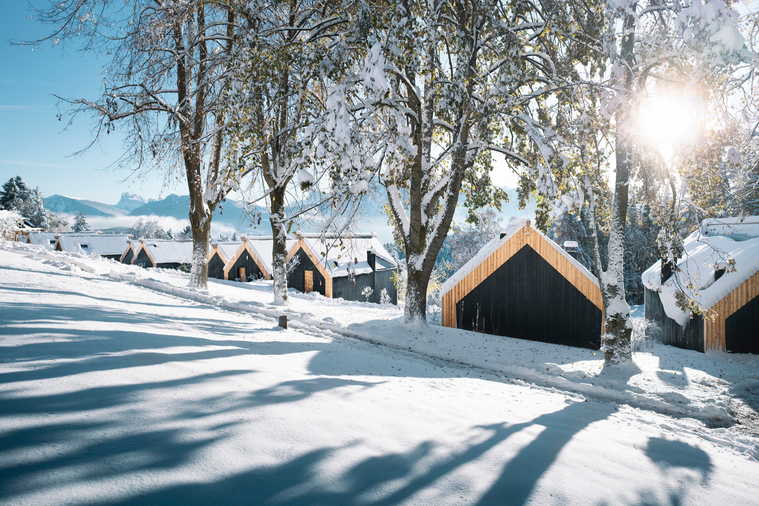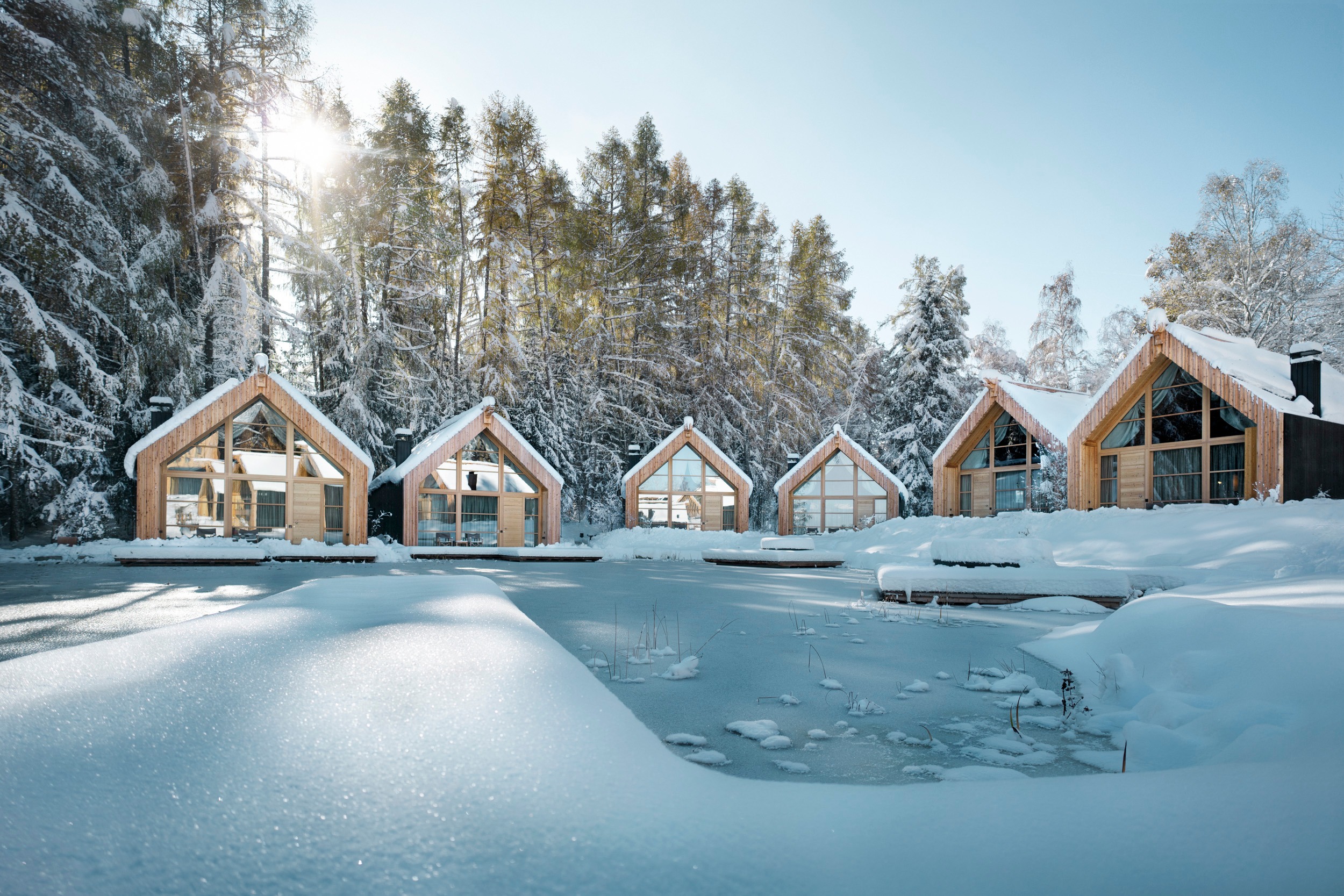 Ihre 55 bis 140 m² große Rückzugsoasen aus Lärchenholz bieten Kamin, Biosauna und Terrasse.