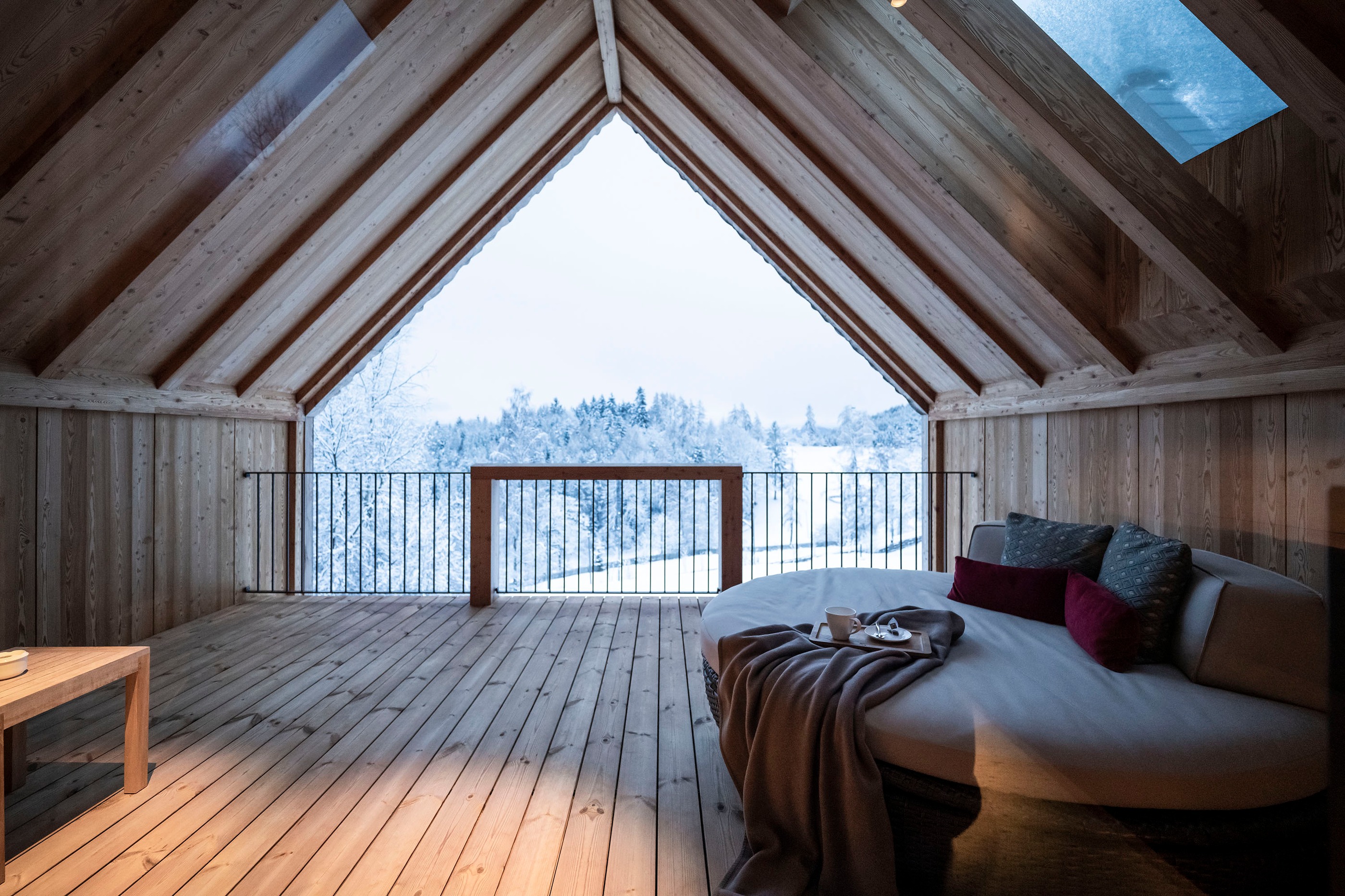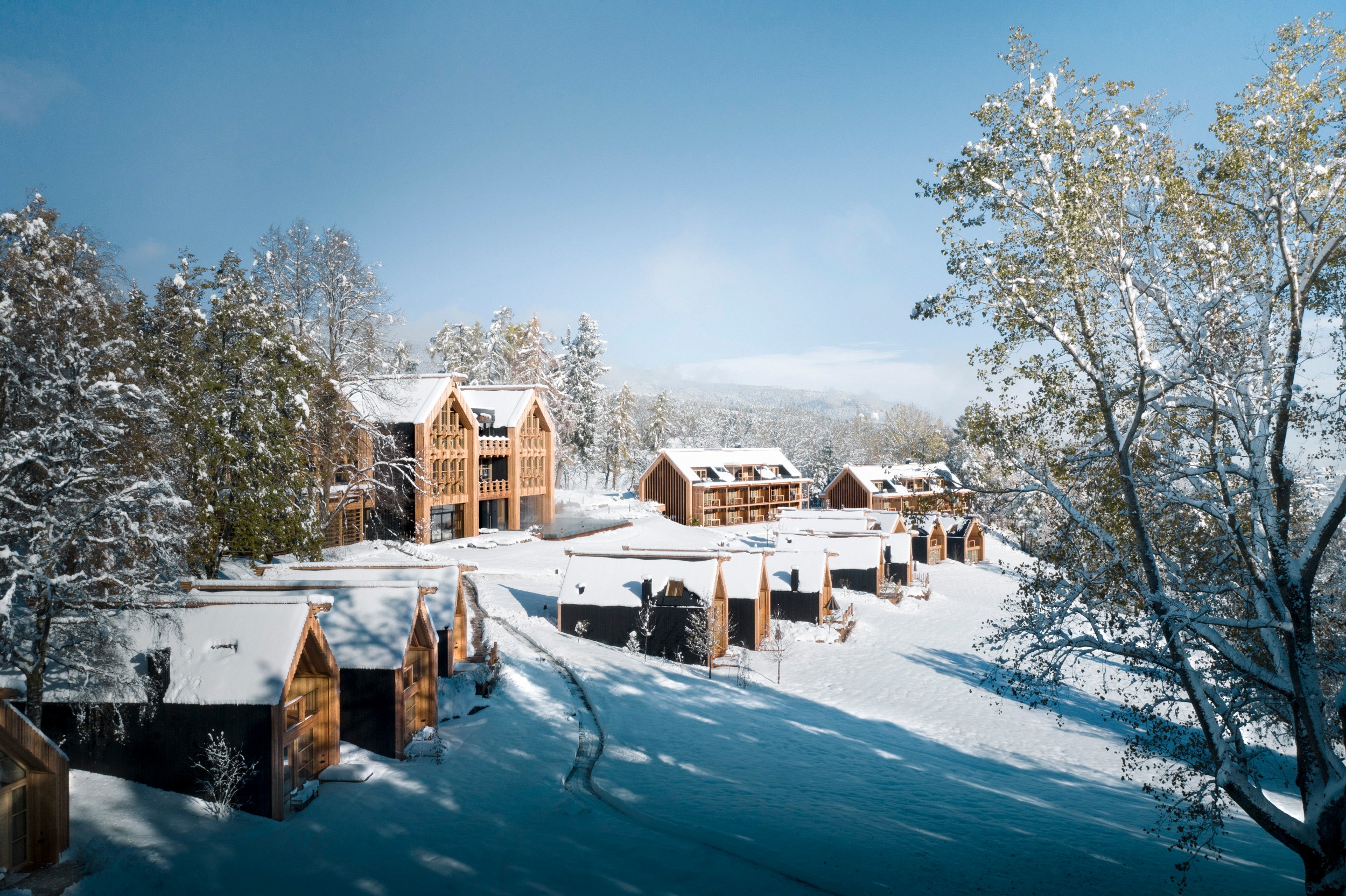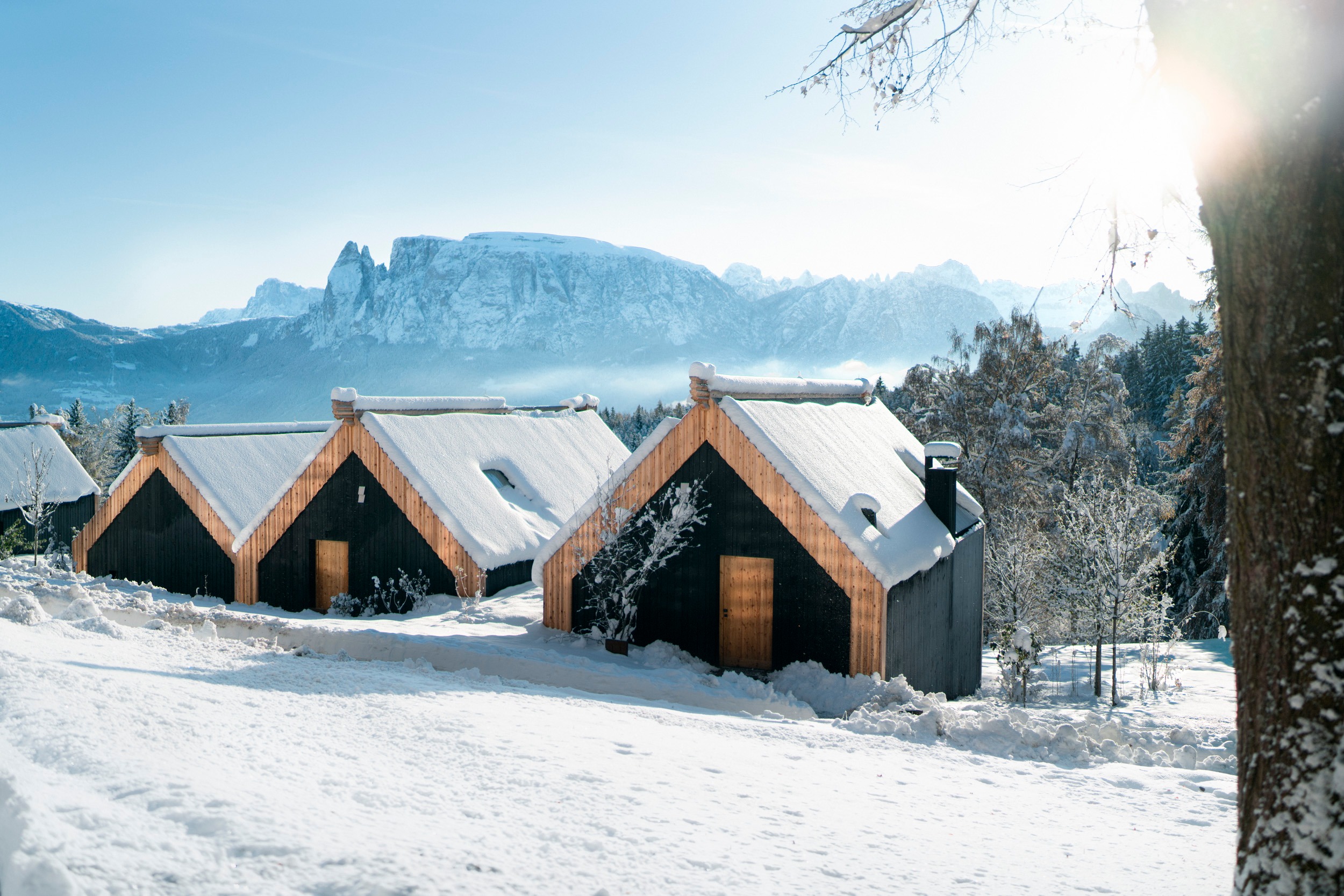 Ihre 55 bis 140 m² große Rückzugsoasen aus Lärchenholz bieten Kamin, Biosauna und Terrasse.